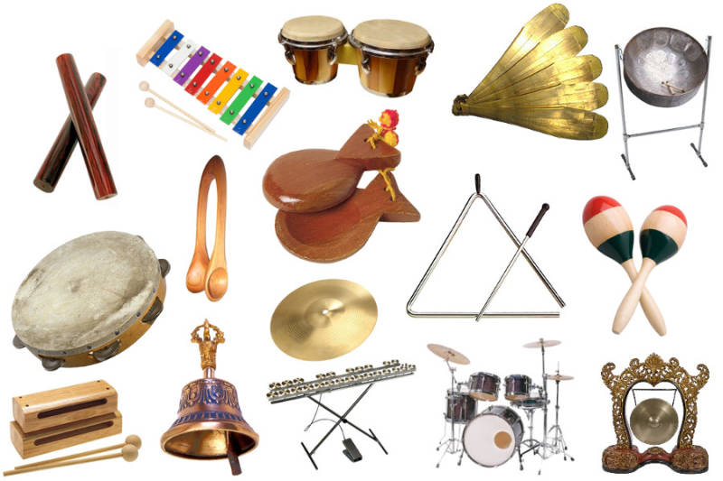 ♪ Idiofonus: garsas išgaunamas virpant pačiam instrumentui (ksilofonas, įvairūs barškučiai). Skirstomi į smūginius, perkusiją, purtomuosius, braižomuosius, dvidalius ir skambinamuosius.